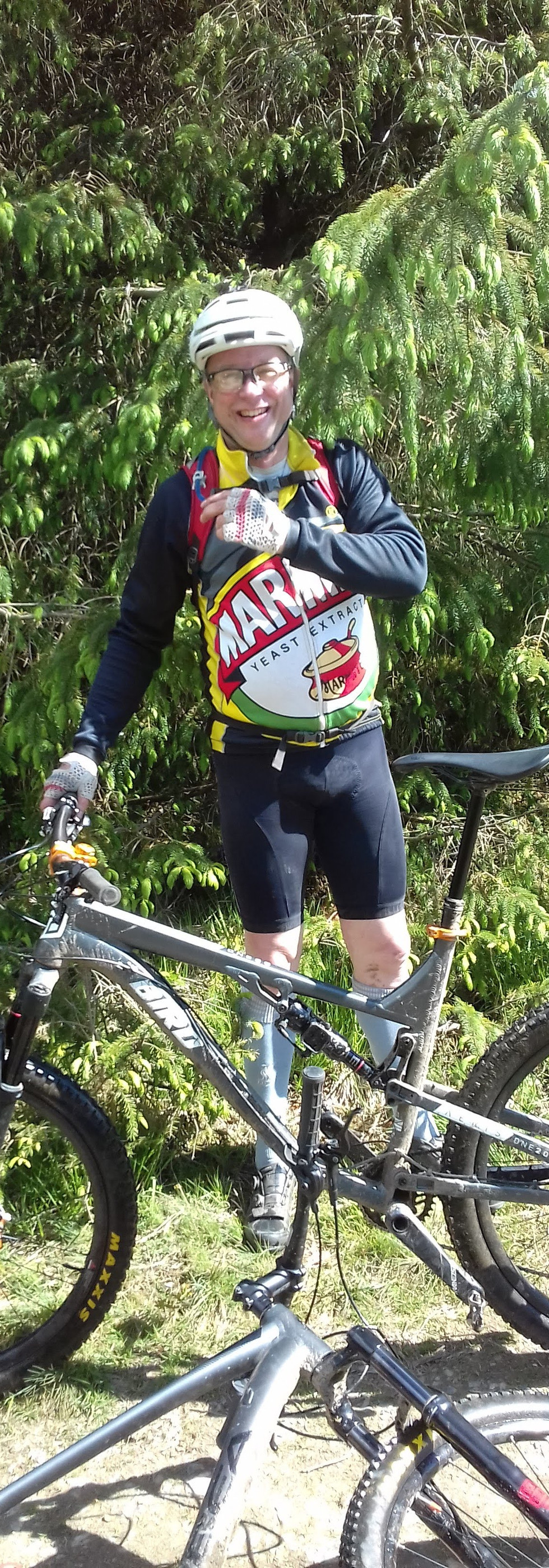 A bit more climbing and then down a rock-strewn chute – oh my goodness what fun. We meet some motor bikers illegally riding in the woods – apparently, they are a complete nightmare, ripping up our MTB trails, but they are courteous enough.