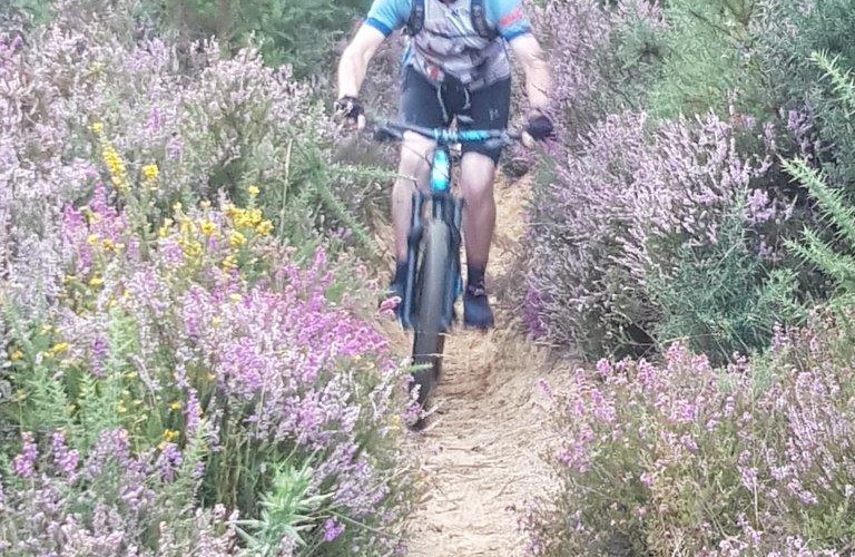 After stating that we had the express permission of the National Trust to ride on anything we fancied, we continued on our way to echoes of "I hope I don't meet you coming the other way" coming from our friendly local. So we wound up a technical uphill singletrack through the heather to a spectacular view at the top. Then through another kissing gate thing and a windy woodland pine trail where Simon the Wheels kindly located a hidden tree stump ! This led to a fast downhill section where, you guessed it, we met our friendly local coming the other way with dog and friendly wife in tow. So after a further exchange of pleasantries we continued on our way to an uphill grind to the aptly named Beacon Hill.